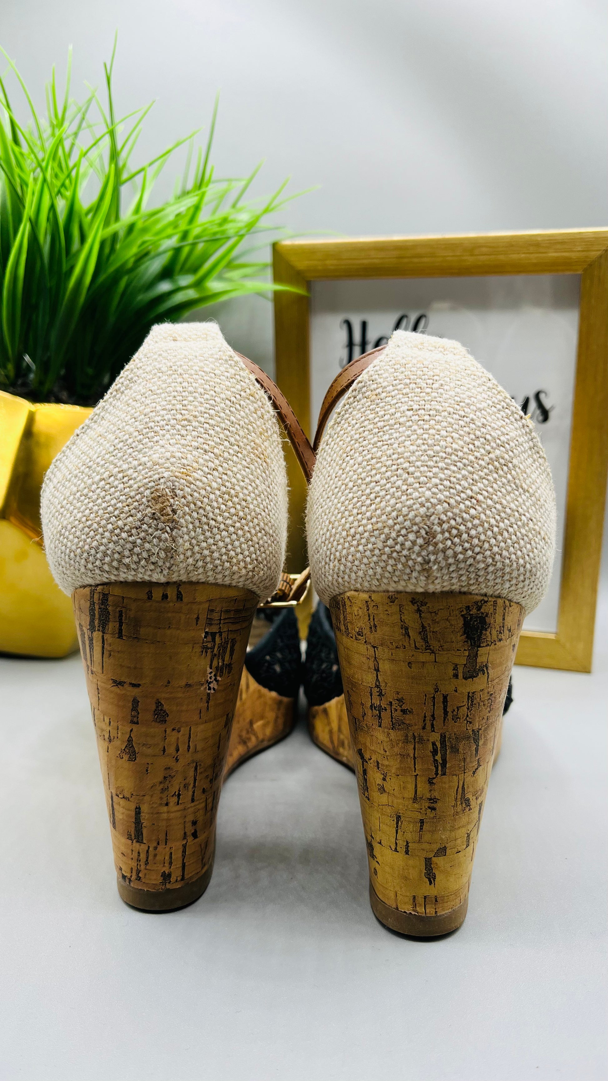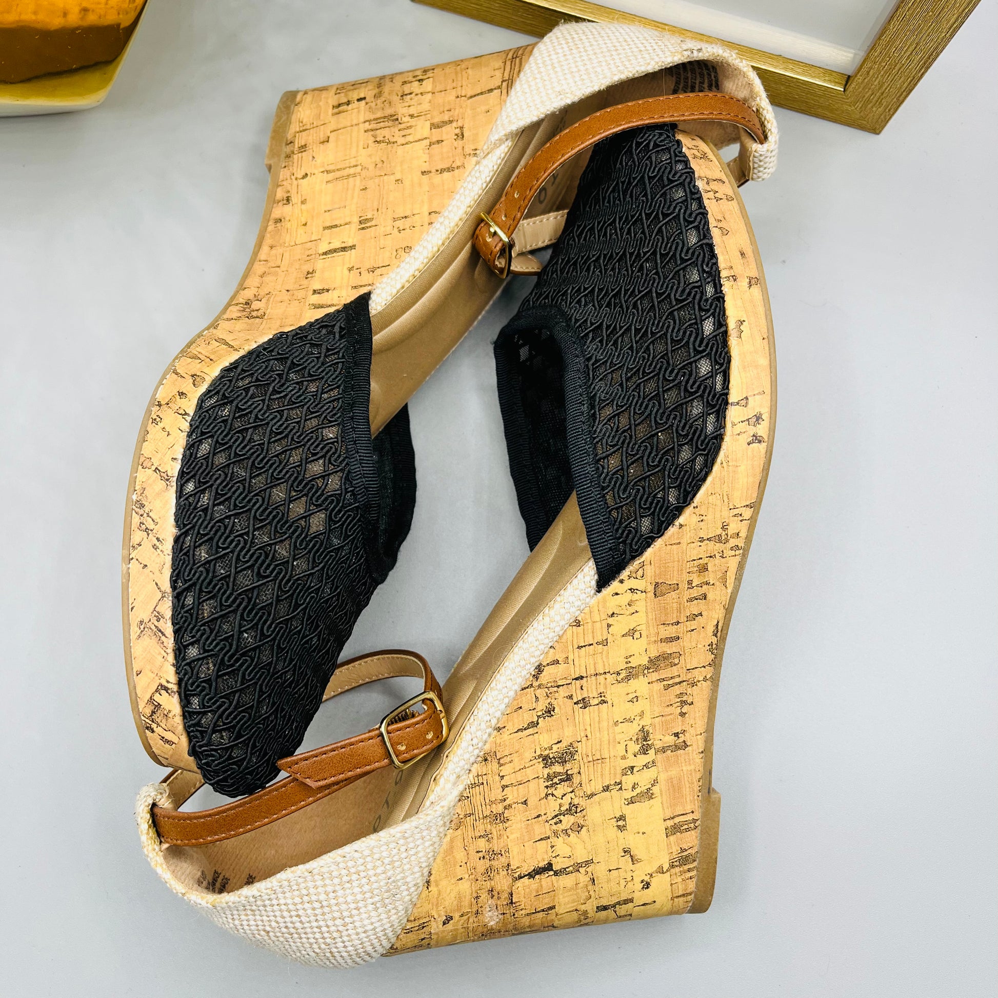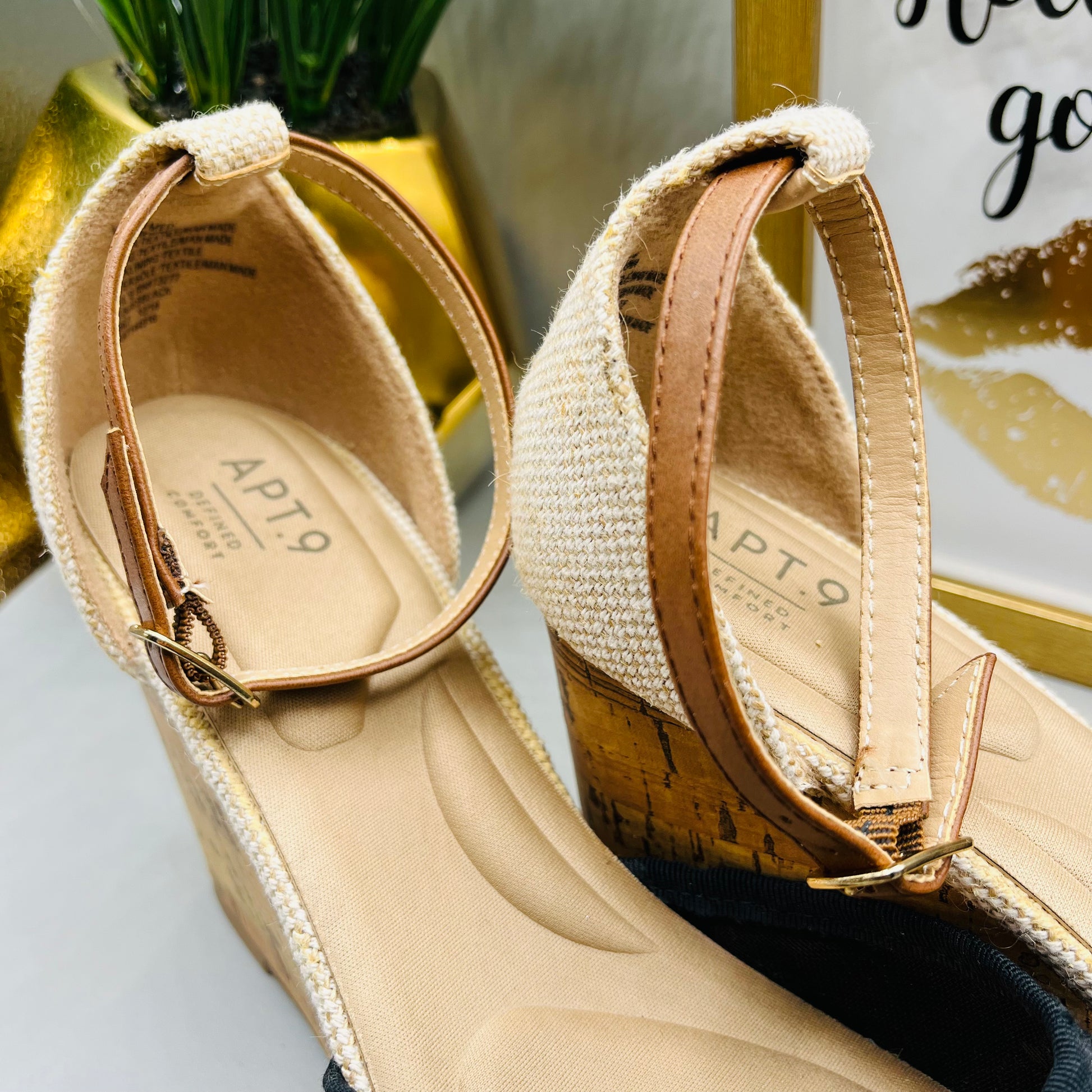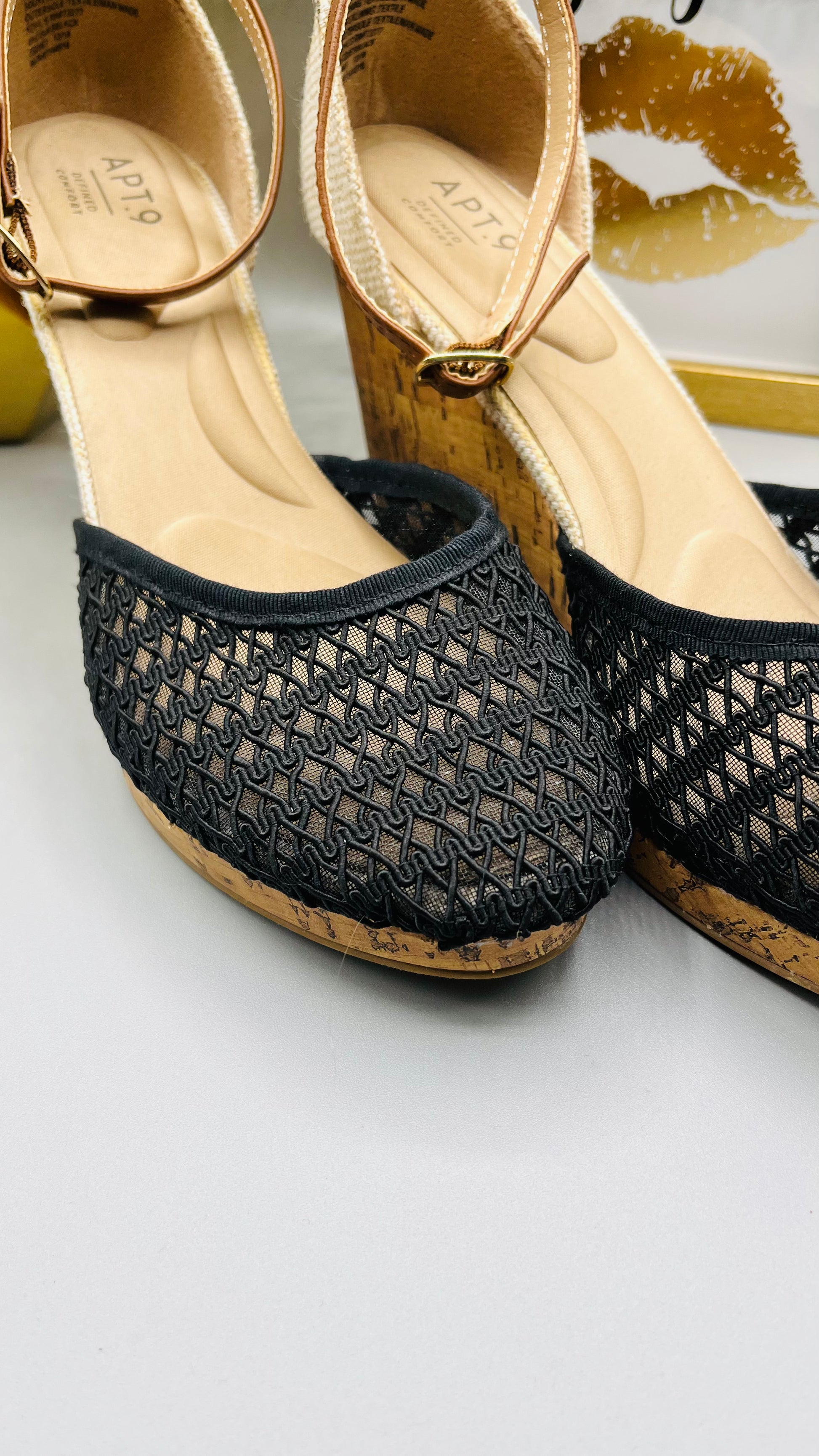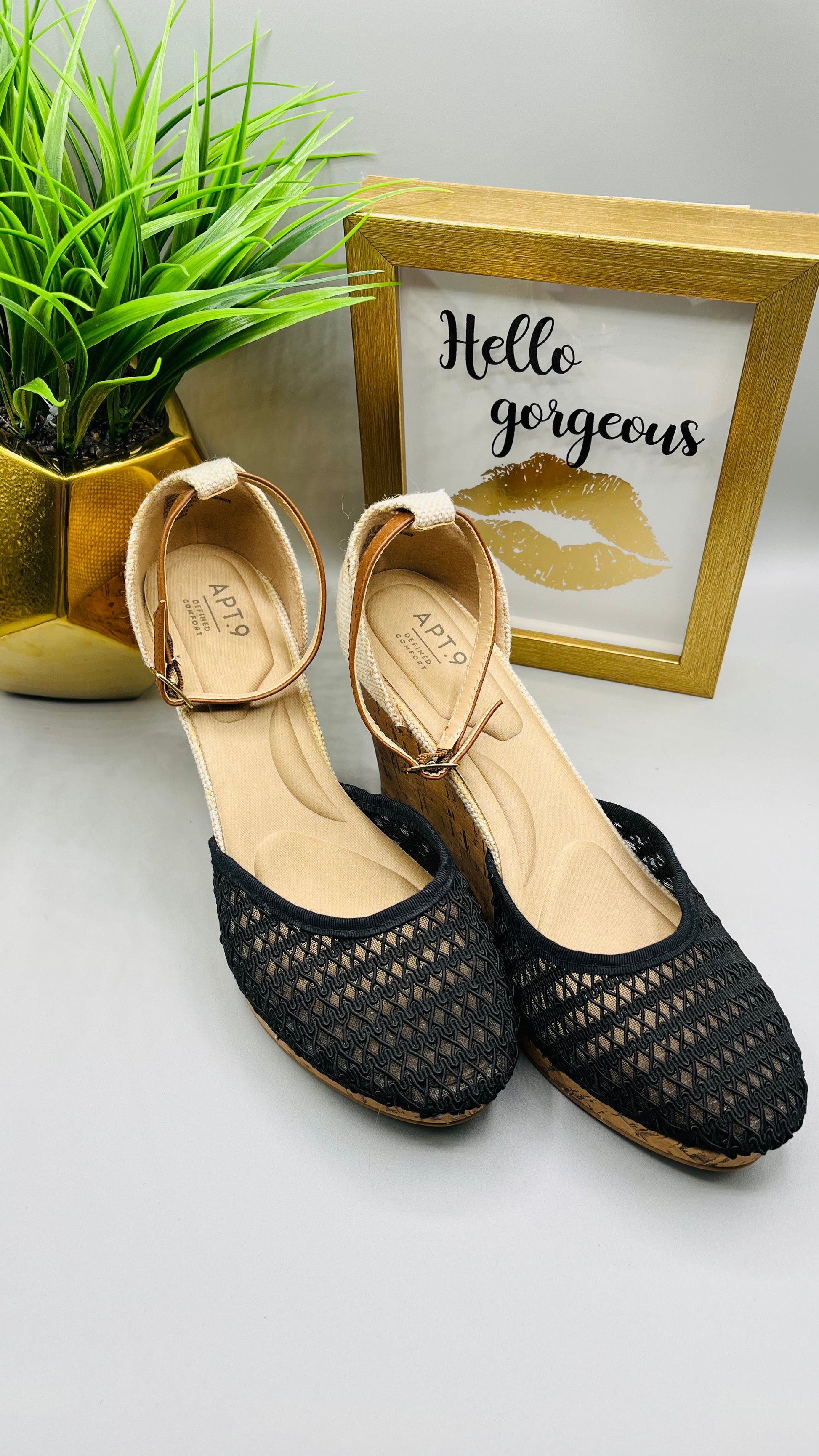 This pair of Apt 9 black wedges are in preloved, but like new condition. The classic styling is perfect for pairing with office looks or dressing up for special occasions. With the cushioning and support of a heel, you'll be on your way in style and comfort.