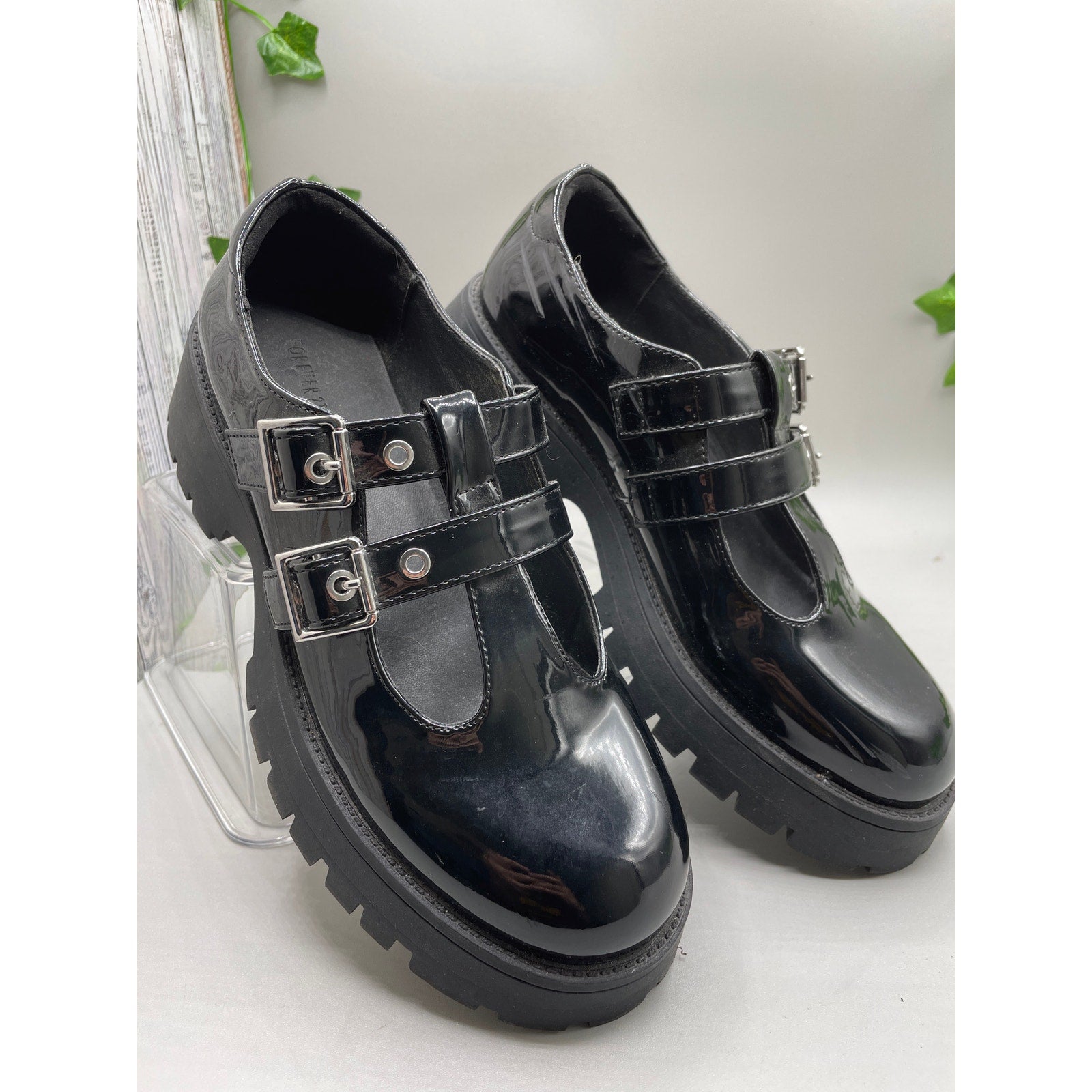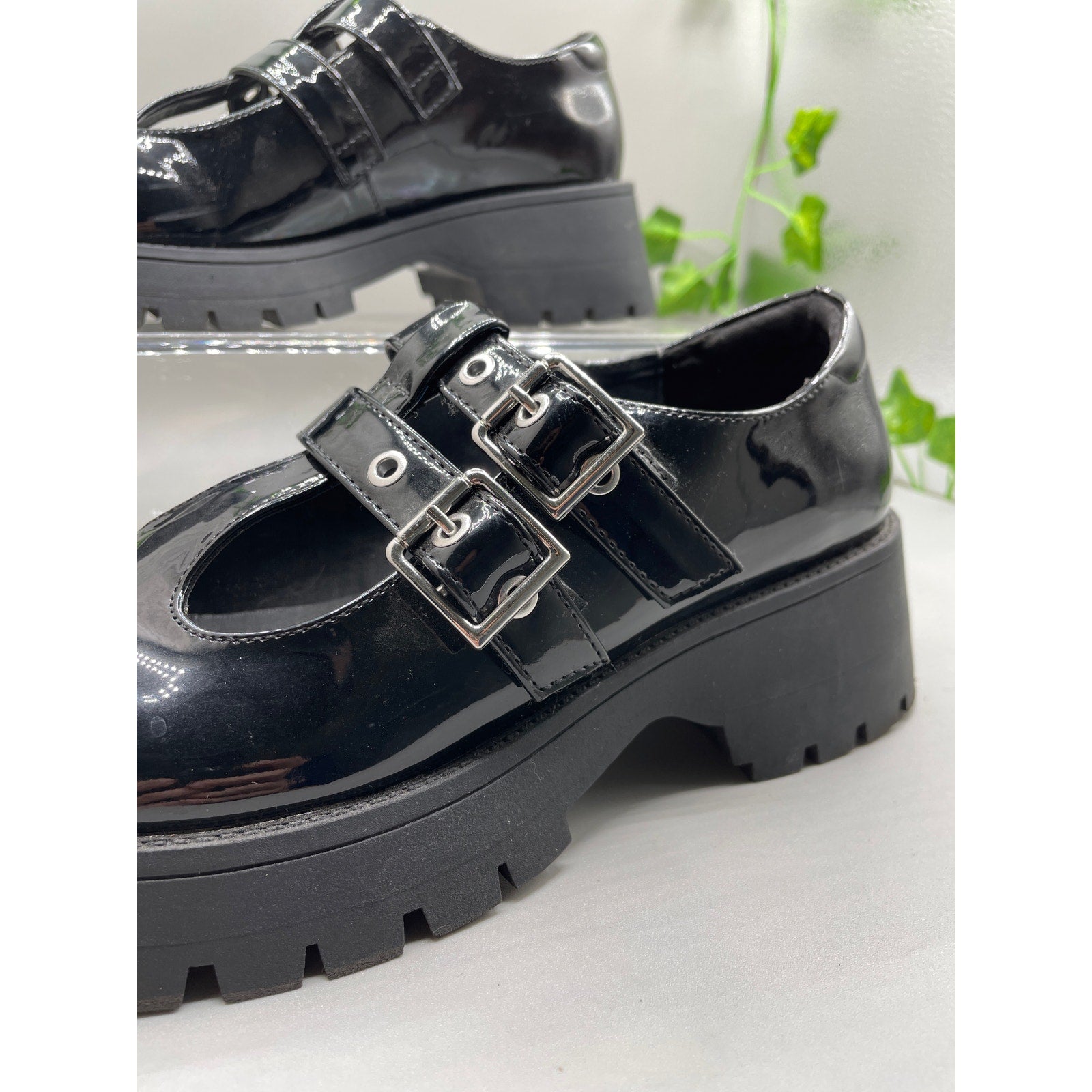 These babydoll-style loafers feature a classic design with a modern platform twist. The black patent leather gives them a sleek and polished look, while the buckle adds a charming detail.