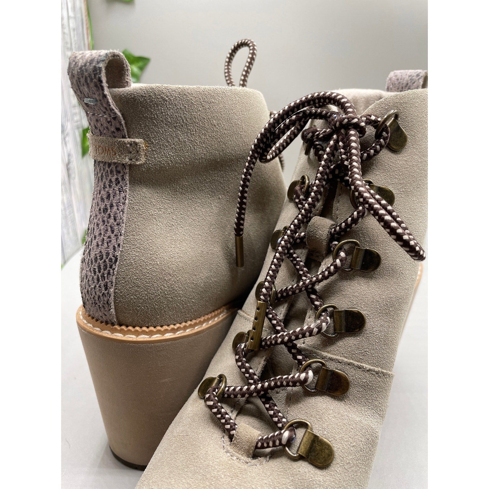 Step out in style with these beautiful new TOMS wedge platform boots! These tan lace-up boots are perfect for adding a touch of elegance to any outfit.
